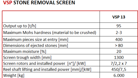 The stone separating screens, type VSP, are designed to handle soft to medium-hard clays (up to a maximum hardness of about 2–3 on the Mohs scale) containing larger stones (up to 300–400 mm).