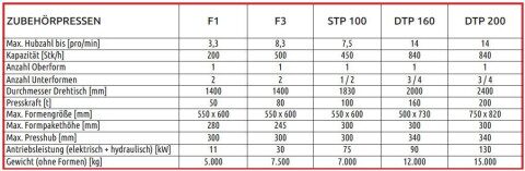 Aufgrund ihrer Bauweise mit Drehtisch, auf dem von einer bis vier untere Pressformen montiert werden können, und des hydraulisch gesteuerten Kompressors mit einer oberen Pressform bieten die Pressen des Typs DTP und F ein Höchstmaß an Flexibilität.